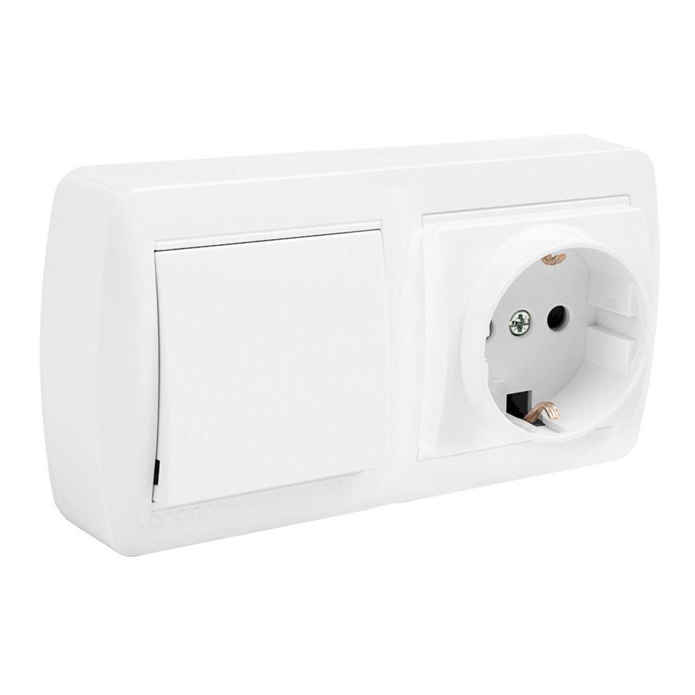 BASE FIJA 2P+T 16A 250V + CONMUTADOR/INTERRUPTOR 10AX 250V SUPERFICIE MURAL 148 x 72 x 42 mm